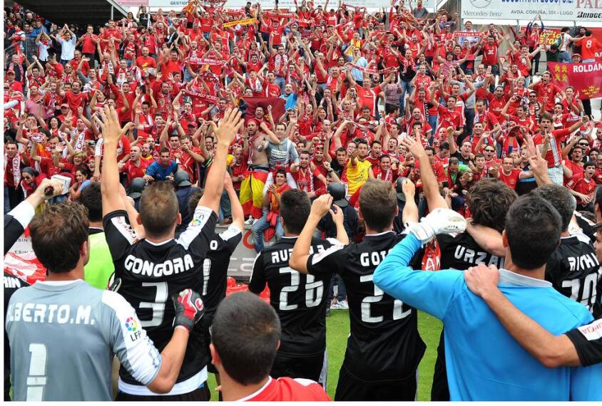 Sin embargo, en ese momento los jugadores del Murcia empezaron a abrazarse, y a hacer piña. Se acercaron a ese sector de la grada del estadio lucense que se había teñido de grana, y se vio la hermosa comunión de un equipo con sus fieles. De un grupo de hombres que habían luchado juntos hasta conseguir su objetivo. Unos sobre el verde, y otros desde la grada. En ese instante pasaron miles de imágenes de esta temporada por mi retina: las goleadas en NC, las encerronas superadas a domicilio, la unión de los muchísimos abonados durante toda la liga, la visita de miles de murcianistas al Bernabeu un miércoles cualquiera… Me acordé también de las veces que he visto a los jugadores de paseo por los centros comerciales, ejerciendo de murcianos de a pie. O compartiendo coche, los más jóvenes, para ir a Cobatillas. Estando cerca de nosotros –sólo hay que ver las imágenes de la celebración en la Redonda, para entender a qué sentimiento de cercanía me refiero-. Este año, como ninguno de los anteriores, ha existido una gran unión de todos los que hacemos al Murcia lo que es: un grande. Porque sin los jugadores, su esfuerzo y su talento, no hubiese sido posible el retorno. Pero tampoco sin el aliento incansable de una afición que se supo levantar, de forma admirable, de la tragedia de Montilivi.